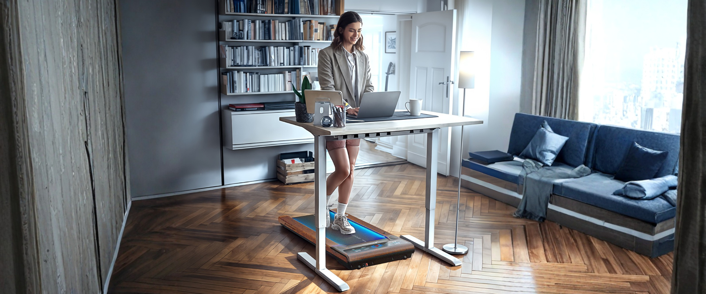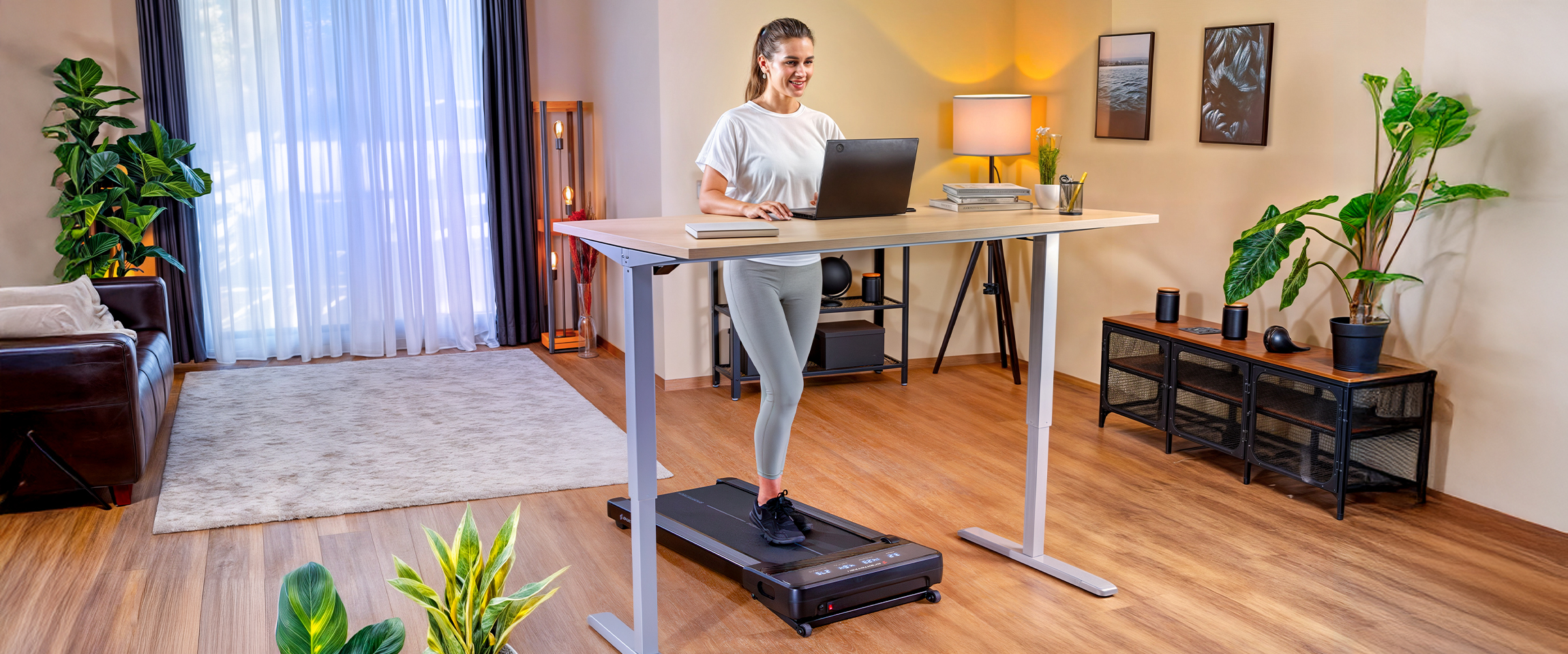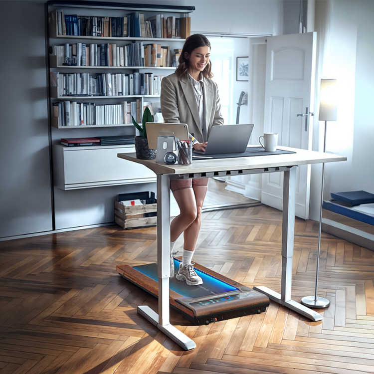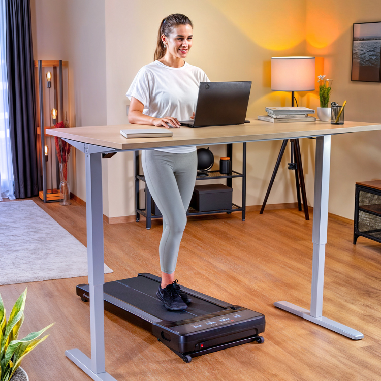 Kombiniere dein Walking Pad am Schreibtisch mit einem höhenverstellbaren Tisch. So kannst du fließend zwischen Sitzen, Stehen und Gehen wechseln. Das fördert die Durchblutung, entlastet den Rücken und hält dich über den Tag aktiv.